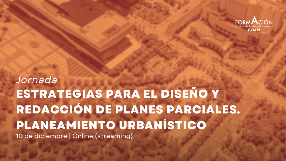 El Instituto de Formación Continua del COAM organiza la jornada Estrategias para el diseño y redacción de planes parciales. Planeamiento Urbanístico, una sesión técnica dirigida a arquitectos, urbanistas, proyectistas, técnicos municipales y profesionales vinculados al desarrollo urbano y la planificación territorial. Se realizará en formato streaming y puedes inscribirte en este enlace.
