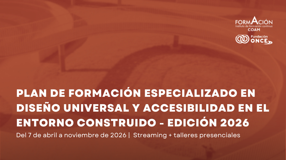 Un año más, el Colegio Oficial de Arquitectos de Madrid, a través del Instituto de Formación Continua COAM, y en colaboración con la Fundación ONCE, imparte el Plan de Formación Especializada en Diseño Universal y Accesibilidad en el Entorno Construido – Edición 2026. Este itinerario formativo, consolidado ya como referente a nivel nacional, está dirigido a profesionales que proyectan, diseñan o gestionan el entorno construido y desean integrar la accesibilidad como elemento esencial en la arquitectura contemporánea.