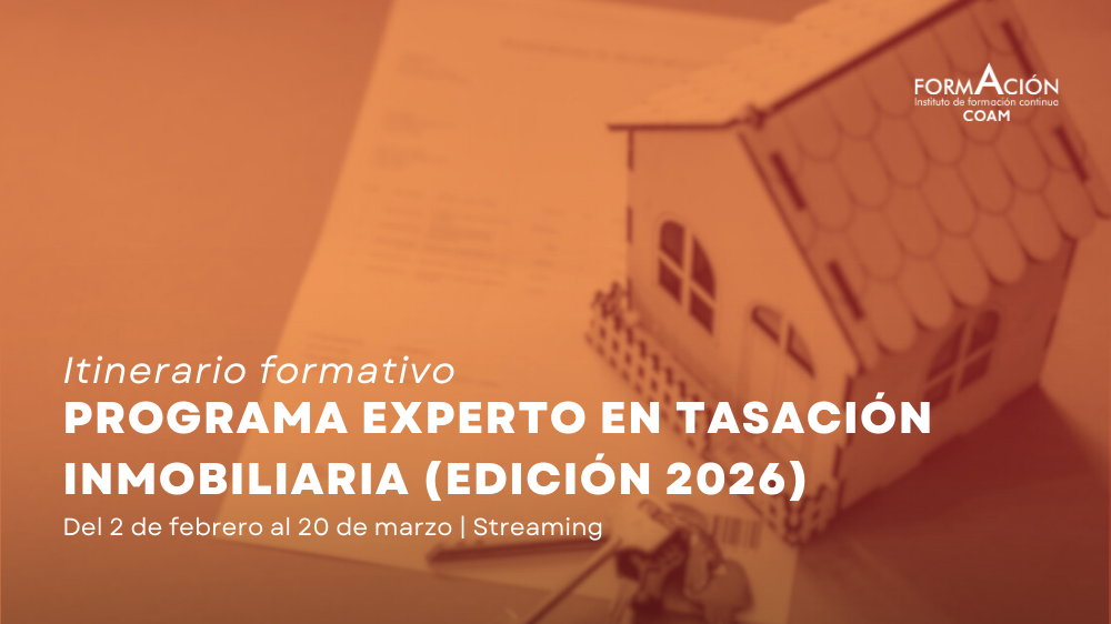 El Instituto de Formación Continua COAM, en colaboración con Arquitasa Sociedad de Tasación, pone en marcha una nueva edición del Itinerario formativo – Programa Experto en Tasación Inmobiliaria – Edición 2026. Este itinerario formativo está pensado para aquellos que quieran introducirse y profundizar en el ámbito de la valoración inmobiliaria, desde los fundamentos básicos hasta el análisis avanzado del suelo.